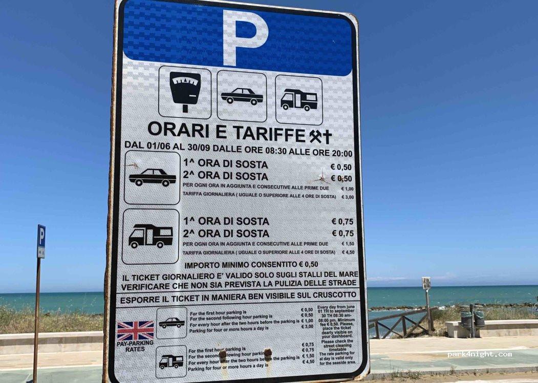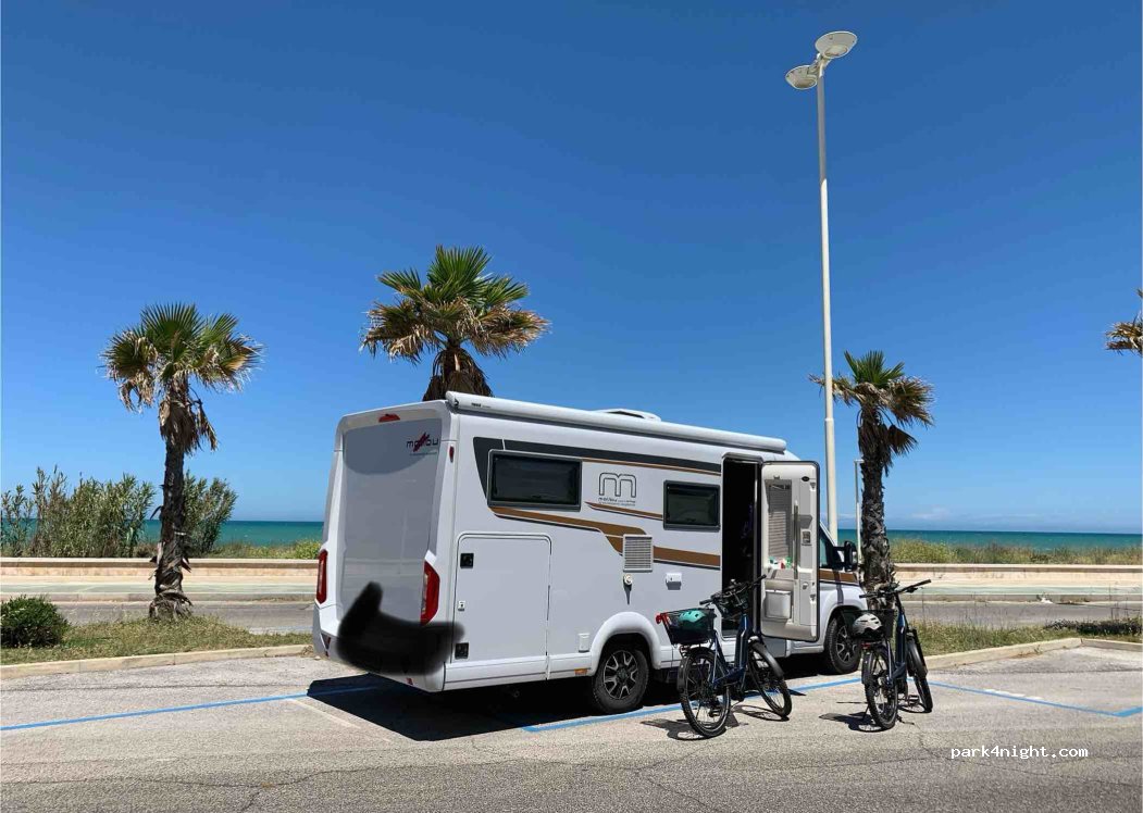 Parcheggio sul mare per auto e camper. Parcheggio a pagamento, 75 centesimi per la prima e la seconda ora, poi 1.50 euro. Abbiamo sostato qui una notte, passano molte auto, ma nel complesso silenzioso. Si raggiunge il centro in 15 minuti a piedi. In due passi si raggiunge la spiaggia.