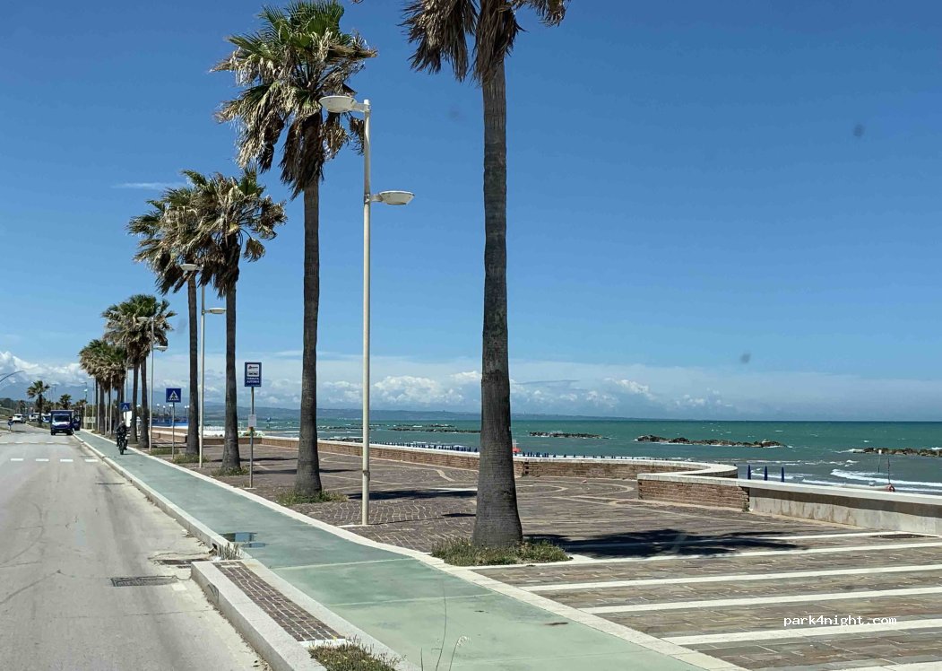 Arrivando alle 21.30 si trova facilmente posto perché fuori dal paese. Al mattino ci si sveglia davanti alla spiaggia. Non ci ha dato molto fastidio la ferrovia, piuttosto le macchine che andavano abbastanza veloci… va bene per una notte di passaggio e un pranzo di pesce nei ristorantini sul lungomare