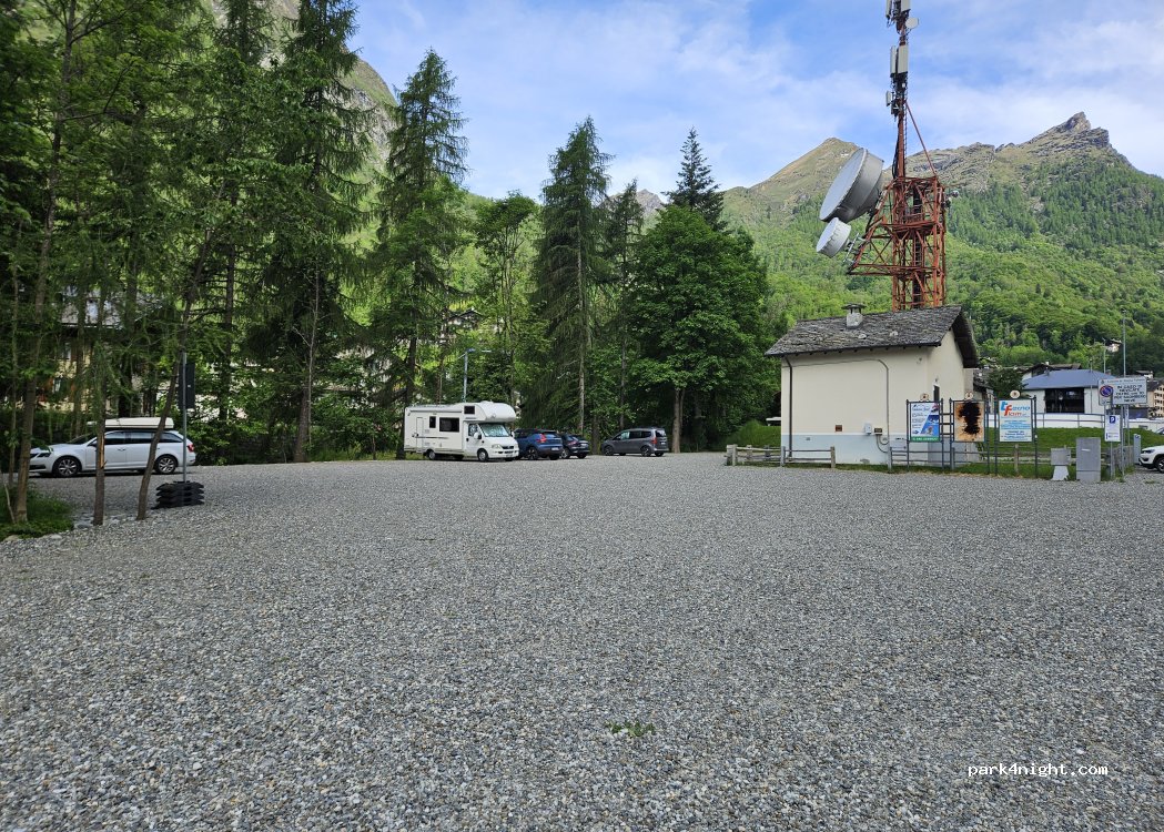Ampio parcheggio a pagamento (A pagamento dal 1° giugno al 15 settembre e dal 1° dicembre al 15 aprile, dalle 8:00 alle 20:00) sterrato. Più affollato di giorno, tranquillo la sera e la mattina presto. La parte dietro l'edificio con l'antenna è isolata dalla strada e ben ombreggiata (alberi con rami alti). Non ci sono ostacoli nella parte posteriore rendendo possibile parcheggiare veicoli più lunghi senza ulteriore ingombro. A due passi dal centro di Alagna, strategico per escursioni partendo dal paese (es. Val d'Otro). Nessun servizio, presenti bidoni per la raccolta differenziata.