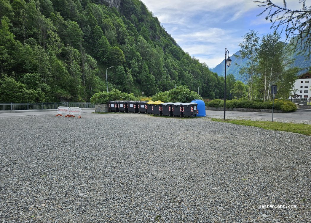 Large paid parking lot (Paid from June 1st to September 15th and from December 1st to April 15th, from 8am to 8pm) dirt. Busier during the day, quiet in the evening and early morning. The part behind the building with the antenna is isolated from the road and well shaded (trees with tall branches). There are no obstacles in the rear part making it possible to park longer vehicles without additional clutter. A stone's throw from the center of Alagna, strategic for excursions starting from the town (e.g. Otro Valley). No services, bins for separate waste collection present.