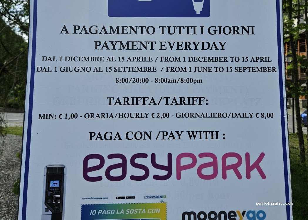 Amplio aparcamiento de pago (de pago del 1 de junio al 15 de septiembre y del 1 de diciembre al 15 de abril, de 8:00 a 20:00 h) de tierra. Mayor afluencia durante el día, tranquilo por la noche y a primera hora de la mañana. La zona trasera del edificio, con la antena, está aislada de la carretera y ofrece buena sombra (árboles con ramas altas). No hay obstáculos en la parte trasera, lo que permite aparcar vehículos largos sin desorden. A tiro de piedra del centro de Alagna, estratégico para excursiones que parten del pueblo (p. ej., al Valle de Otro). Sin servicios, pero hay contenedores para la recogida selectiva de residuos.