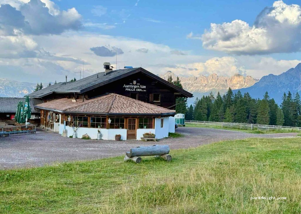 Omdat de eerder gelegen camperplek en parkeerplaatsen vol waren zijn we doorgereden naar de parkeerplaats van de berghut van Malga Ora. ‘s avonds liep de parkeerplaats leeg en hebben we de nacht hier doorgebracht. Pik donker, stil, tussen de koeien. Als je een beetje lef hebt om vrij te staan is dit wel een fantastische plek voor de nacht.
