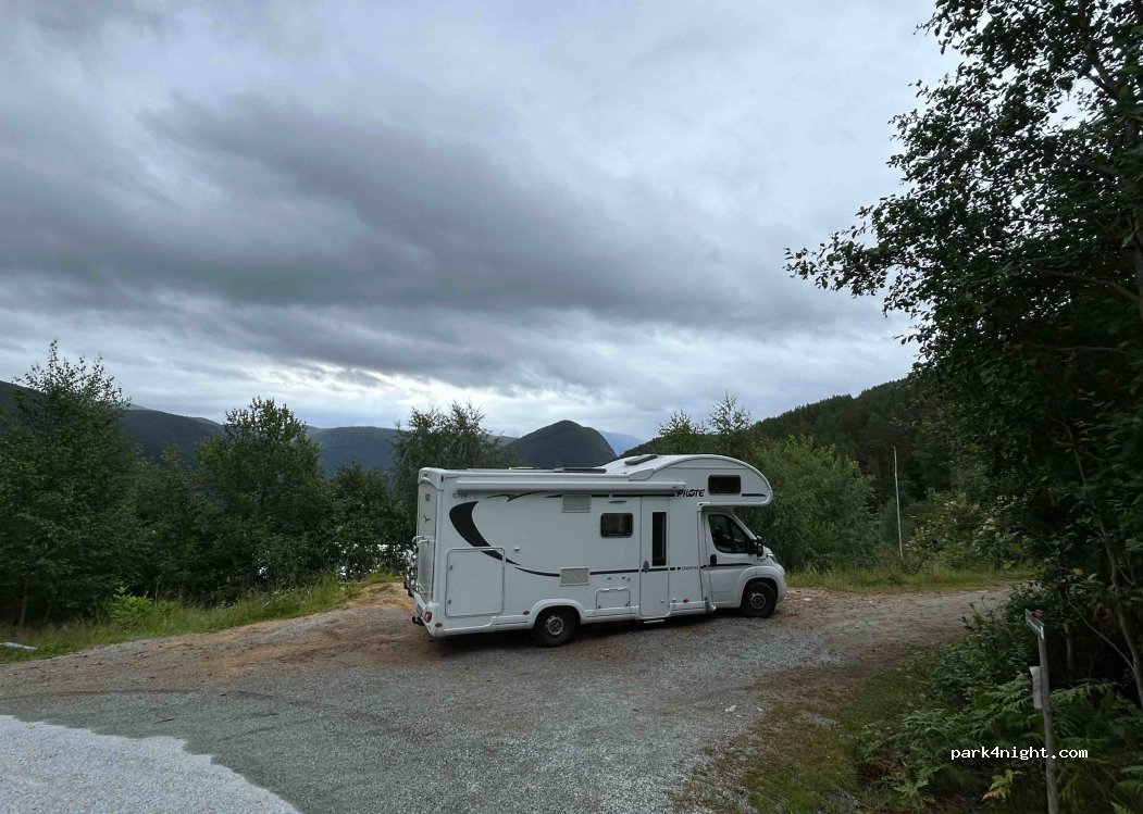 Small space for a mobile home or two small vans in a curve. This is where a hiking trail starts so park that one can walk or cycle by. View of the water and Kaupanger blocked by grown trees in 2024. Calm, occasionally a car or a bus goes by on the road.