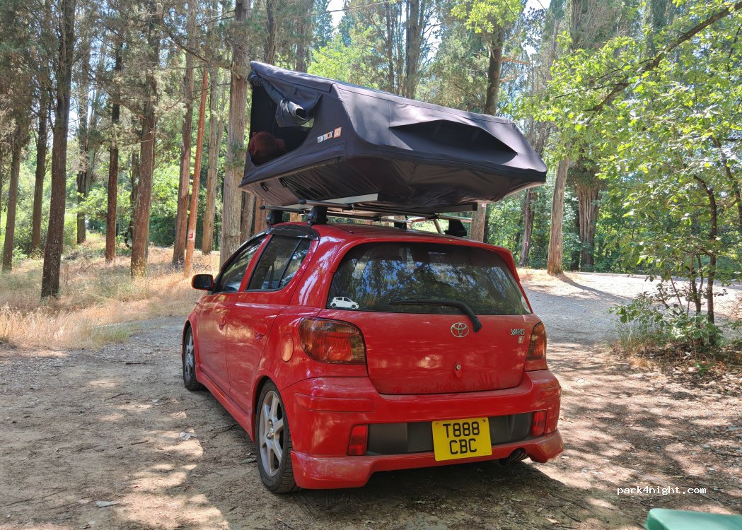 Pasan pocos coches, pero no los suficientes como para molestar, un banco pequeño y con sombra incluso al mediodía, un pequeño claro en el bosque justo al lado de la carretera, lo suficientemente grande para uno o dos campistas aproximadamente.