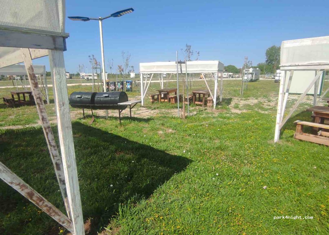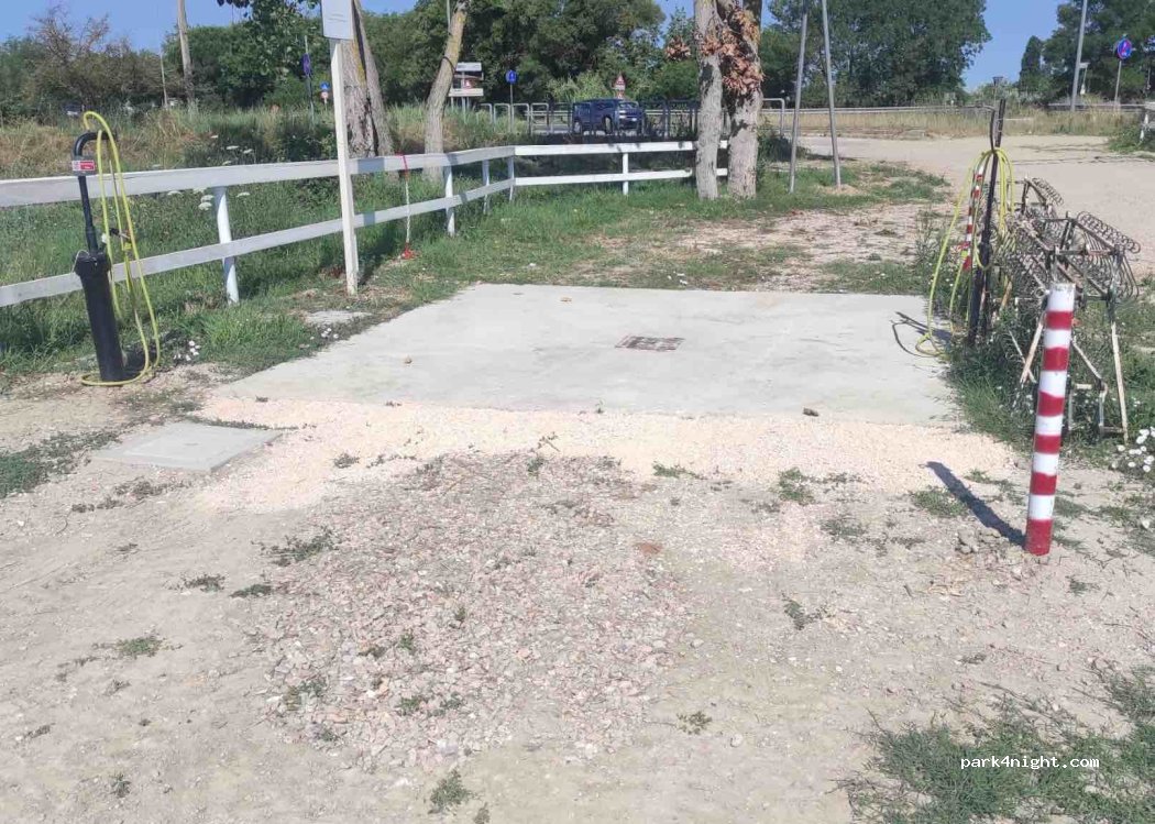 Ampia Area Sosta del 2025, l'area è recintata presidiata e videosorvegliata, 4 docce calde a gettone a consumo,4 bagni, gazebi con tavoloni e barbeque, bidoni diff. con umido e secco scarico wc e grigie, carico potabile, allaccio luce in alcune aree, personale gentile e cordiale con ottima accoglienza, no ombra qualche zanzara al tramonto se non c'è vento. silenziosa la notte, consiglio.