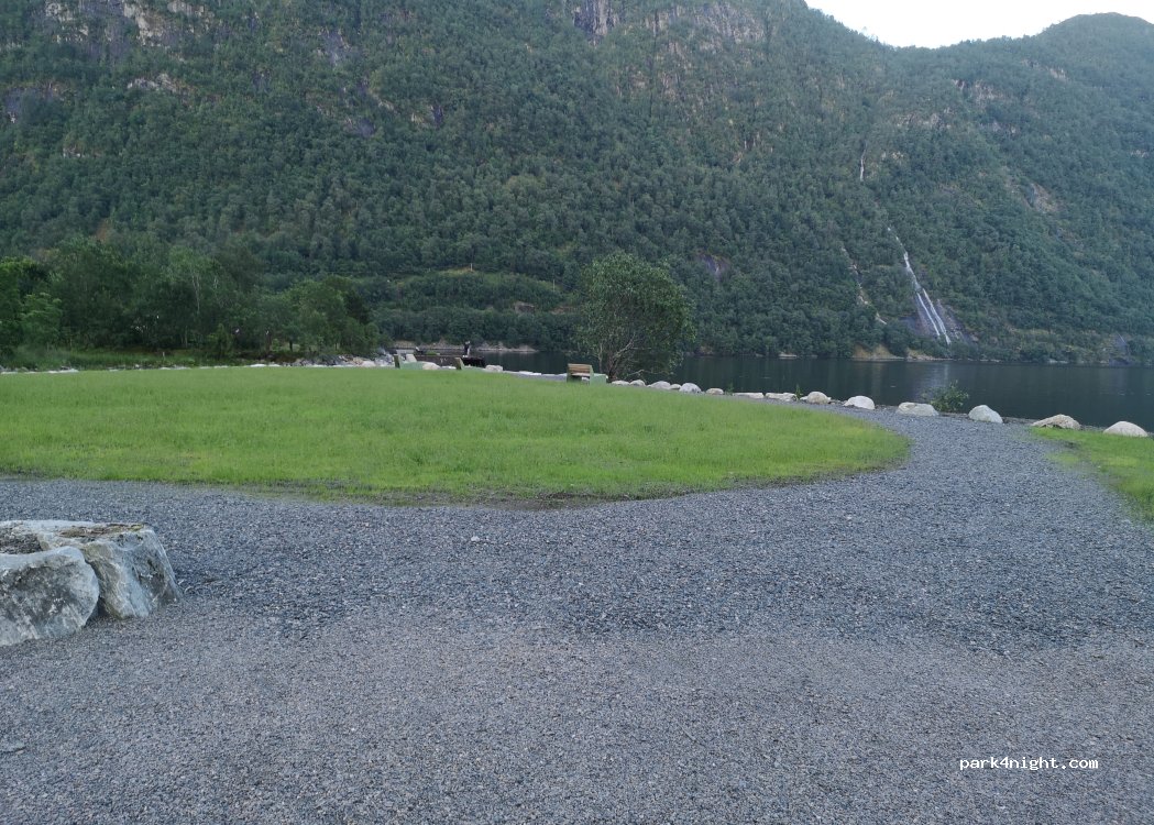 Supermarkt und Klo sind 200 Meter entfernt. Man wird aber mit einer super Sicht auf den Fjord beschenkt. Großer schotterplatz wo ca. 6 Fahrzeuge in erster Reihe und nochmal 6 in zweiter Reihe parken können.