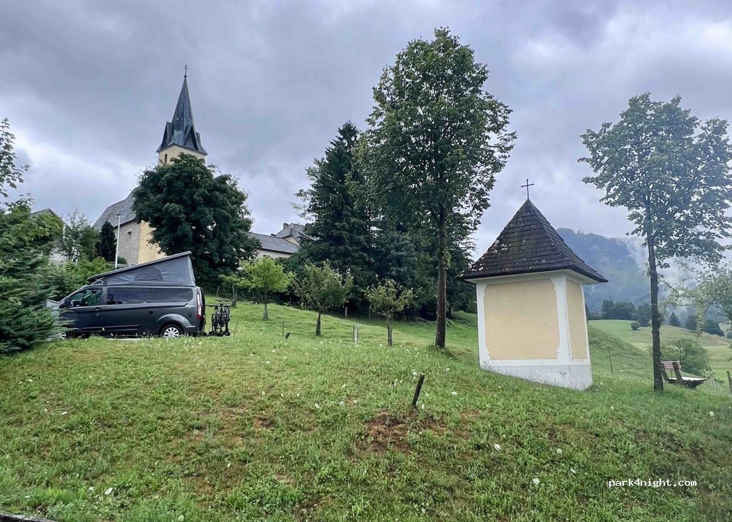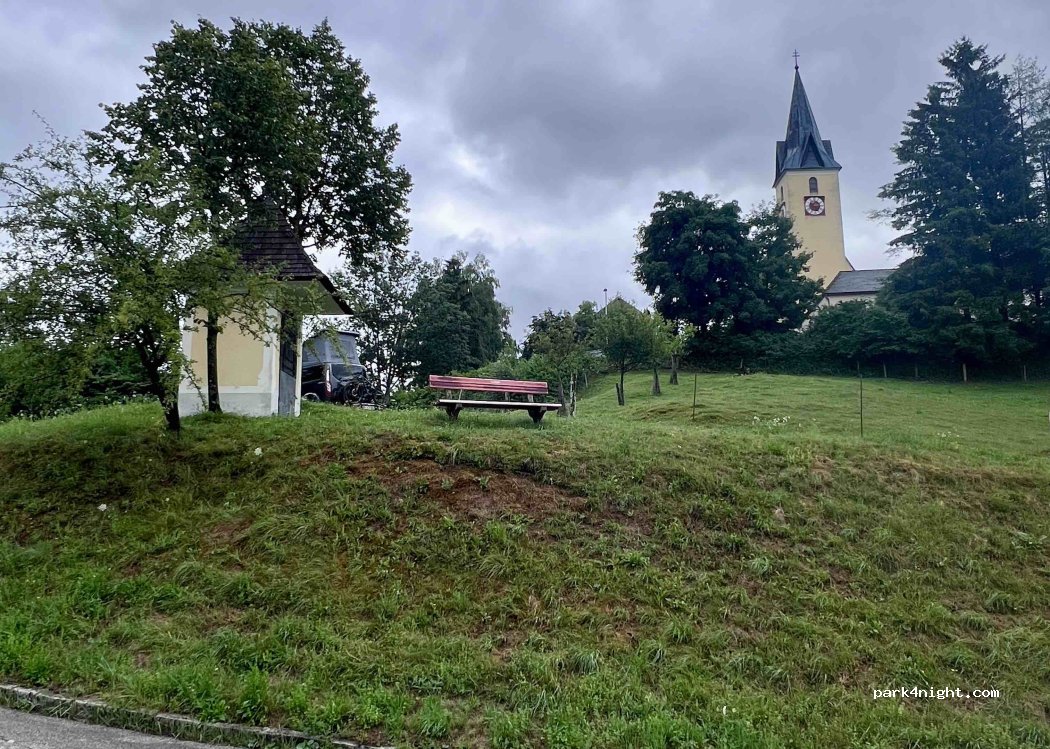 Schöner Stellplatz auf öffentlichem Parkplatz unterhalb der Kirche. Ruhige Gegend, nur ein wenig die Autobahn in der Ferne zu hören. Saubere und neue öffentliche WCs. Schöne Kirche und Anwohner/Kirchenhelfer die sich freuen, dass man dort ist. Wir empfehlen unterhalb der Kirche auf dem genannten Platz zu parken, oben geht’s auch, jedoch sind Scharfe und der Hahn, sowie Glocken läuten- kurze Nacht