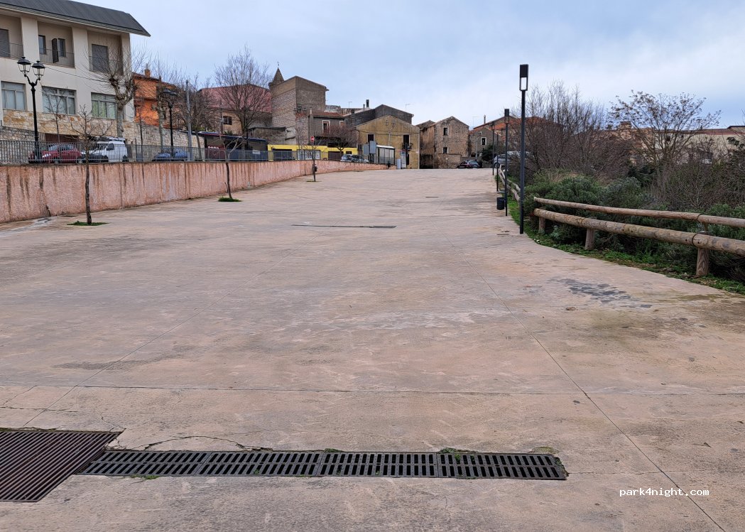 Parcheggio in cemento in pendenza, non c'è ombra, colonnine corrente funzionanti a consumo, ottimo per visitare il paese e il parco. la notte tanti ragazzi in giro e molto rumore.