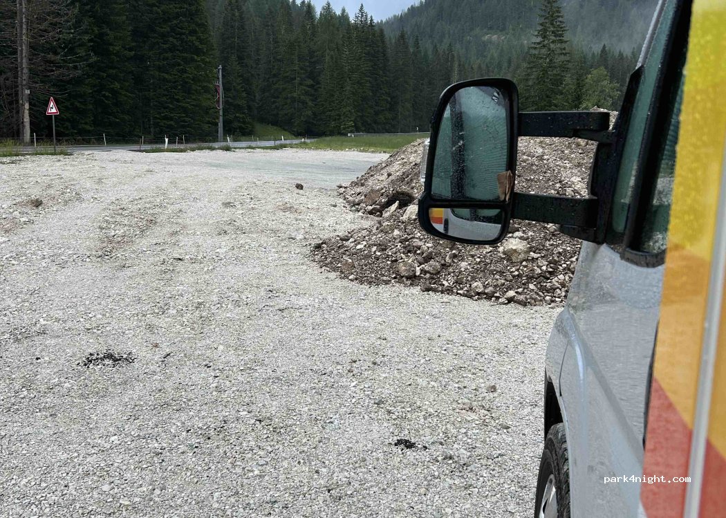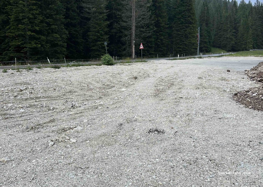 Relativamente pianeggiante e abbastanza grande da ospitare diversi camper. È piuttosto rumoroso durante il giorno perché la strada che porta alle Tre Cime è proprio accanto, ma è molto tranquillo di notte. Si trova sulla riva di un piccolo fiume.