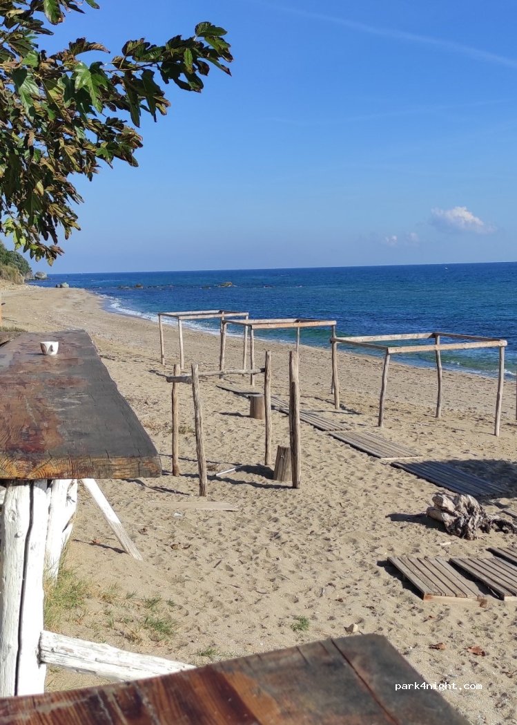 Parking lot directly on the beachfront, just off the main road. Flat area, accessible by car, campers and camper vans. The beach is sandy, suitable for families. There is a beach bar that welcomes campers warmly. Trash cans in zhe main road, no black water or chemical disposal. Toilet in nearby container and beach shower, basic simple efective. Bar manager even let use charge camper battery.