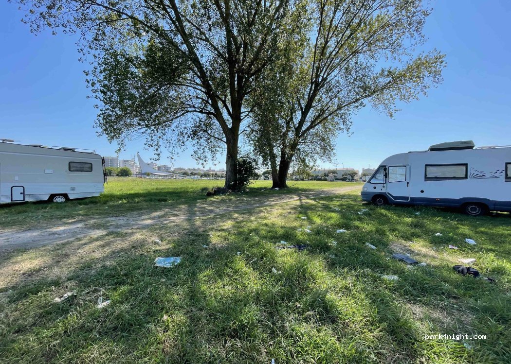 On y a passé la nuit. Très grand parking, il y avait encore énormément de places disponibles. Pas de surveillance. L’herbe est très sale (pleins de déchets par terre). Légèrement bruyant. Très peu d’ombre. On s’y sentait assez en sécurité.