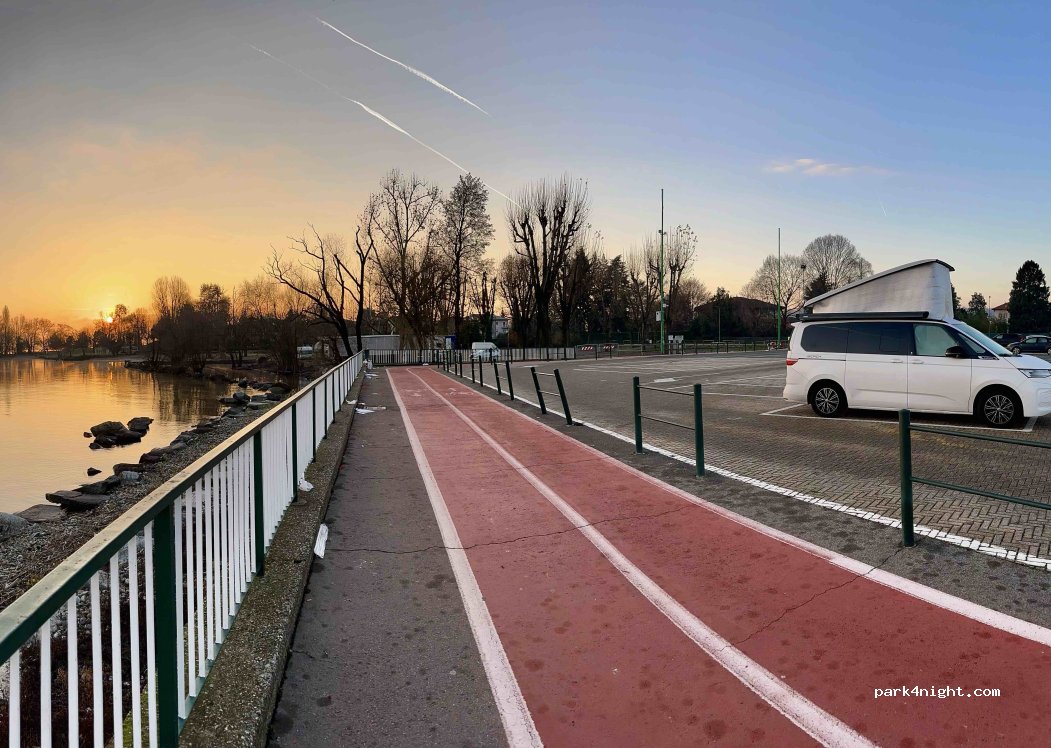 Huge parking lot on the lake, a 5-minute walk from the historic center. There's a barrier limiting height to 2.40 meters, but at this time (July 27, 2025) it's open and there are no restrictions. The local police even stopped by without saying anything. You can park in front of the lake with a beautiful view. The night was quiet, except for the music from a nightclub, but it's far away on the lake. You have to arrive early, by 10:00 at the latest, to find a spot.