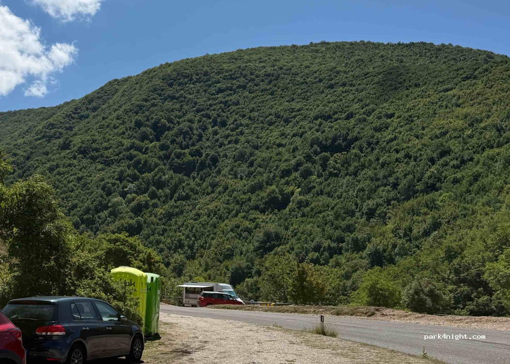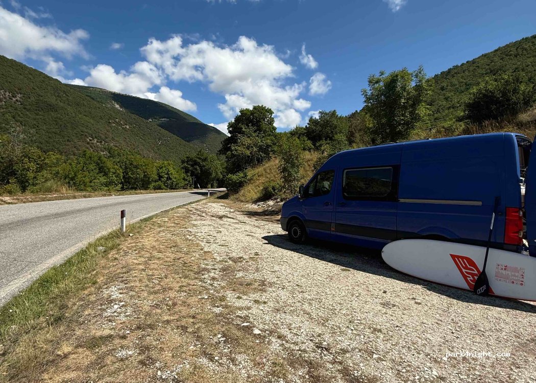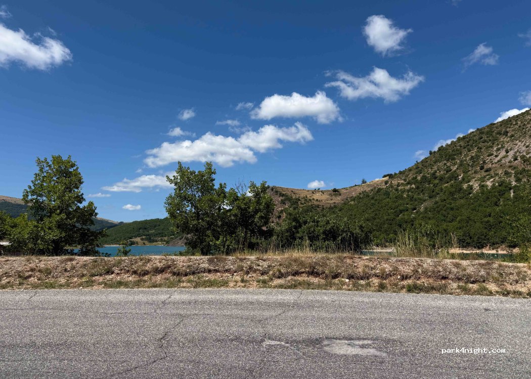 An der Kurve befindet sich ein Parkplatz. Darüber befindet sich ein weiterer Parkplatz, allerdings mit einem „Camper verboten“-Schild. Es fahren nur wenige Autos vorbei, und der Platz ist relativ eben. Schöne Aussicht, viele Picknicktische und direkter Zugang zum See. Von hier aus kann man auch die Wanderung nach Lame Rosse starten. Auf dem Parkplatz gibt es eine saubere Toilette, und gegenüber steht ein Imbisswagen mit leckeren Sandwiches. Dieser Ort ist ein echter Geheimtipp!