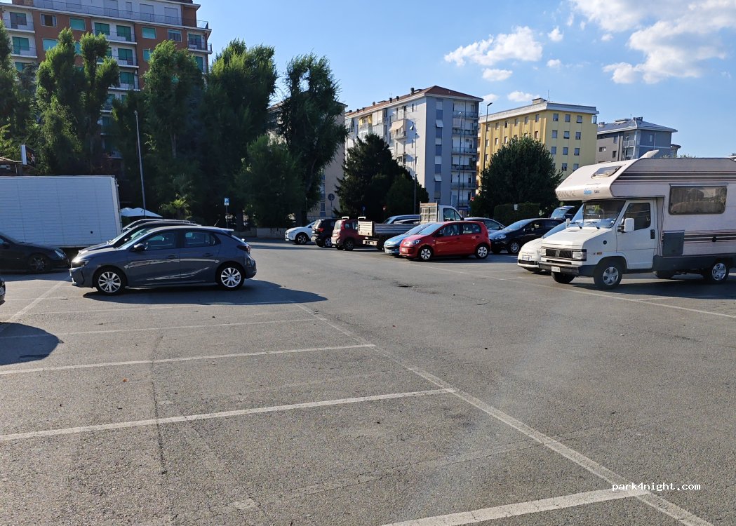 Sehr grosser kostenfreier Parkplatz, auch für CC geeignet ( 2 Plätze benötigt) Es waren noch etliche Parkplätze morgens und mittags frei, sodass das belegen von 2 Parkplätzen kein Problem war.Ca.15 Min. zu Fuss ins Centrum (Rathaus, Touristen Info)