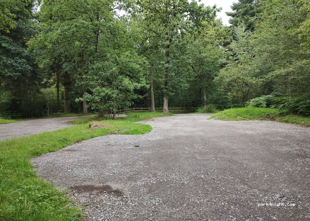Kostenloser Parkplatz mitten im Wald. Flach und geräumig. Die Zufahrtsstraßen sind etwas eng. Keine Schilder, die das Parken über Nacht verbieten.