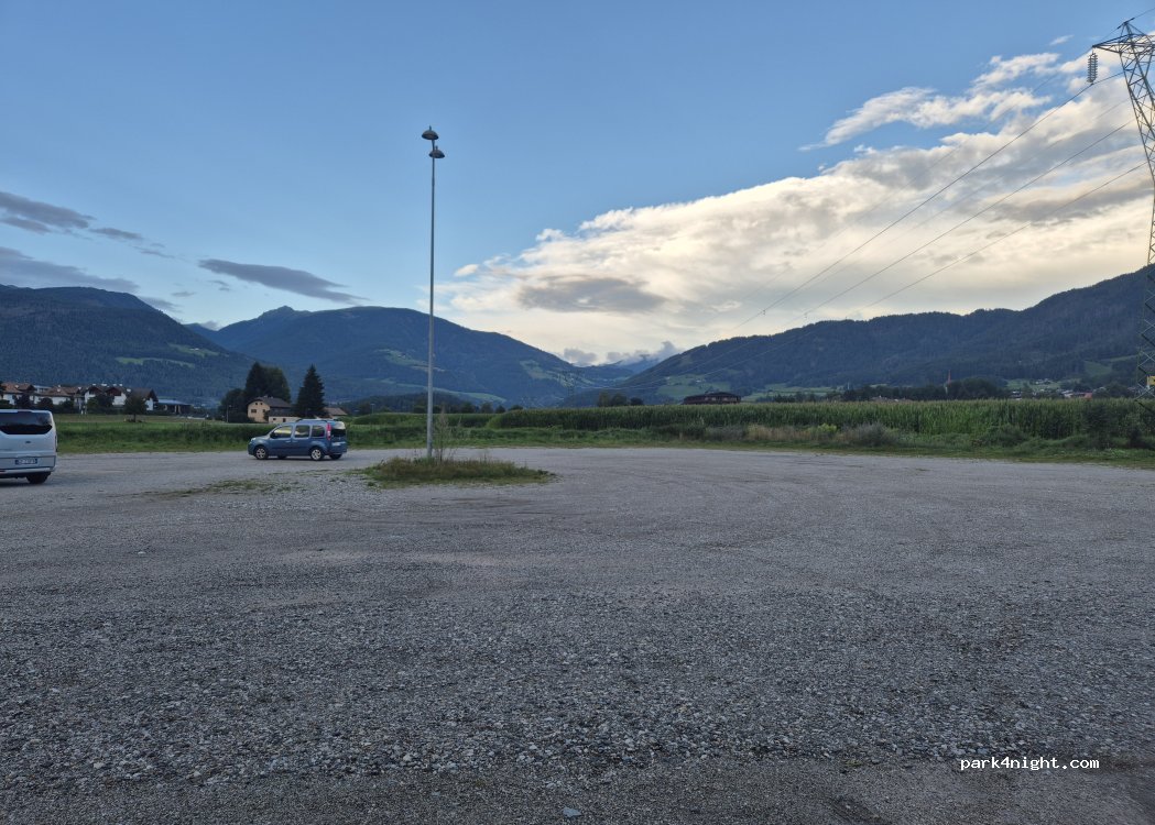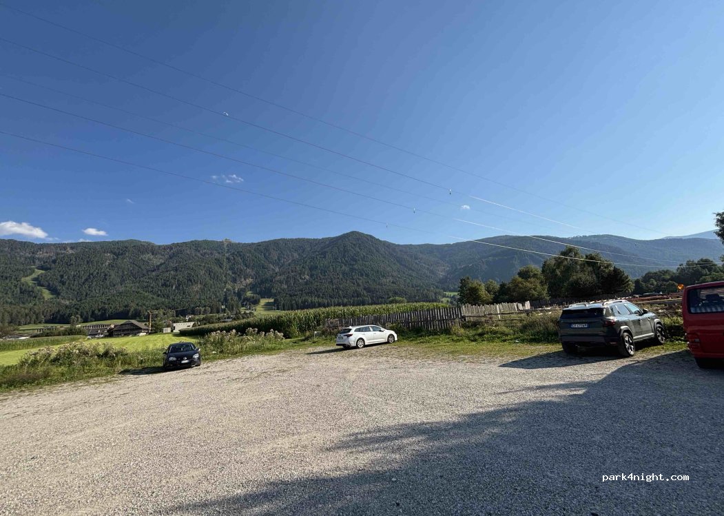 Flat gravel parking area, free of charge. Suitable only for vehicles under 2.4 meters in height. Quiet spot, no services available. Wellness center with Aufguss nearby.