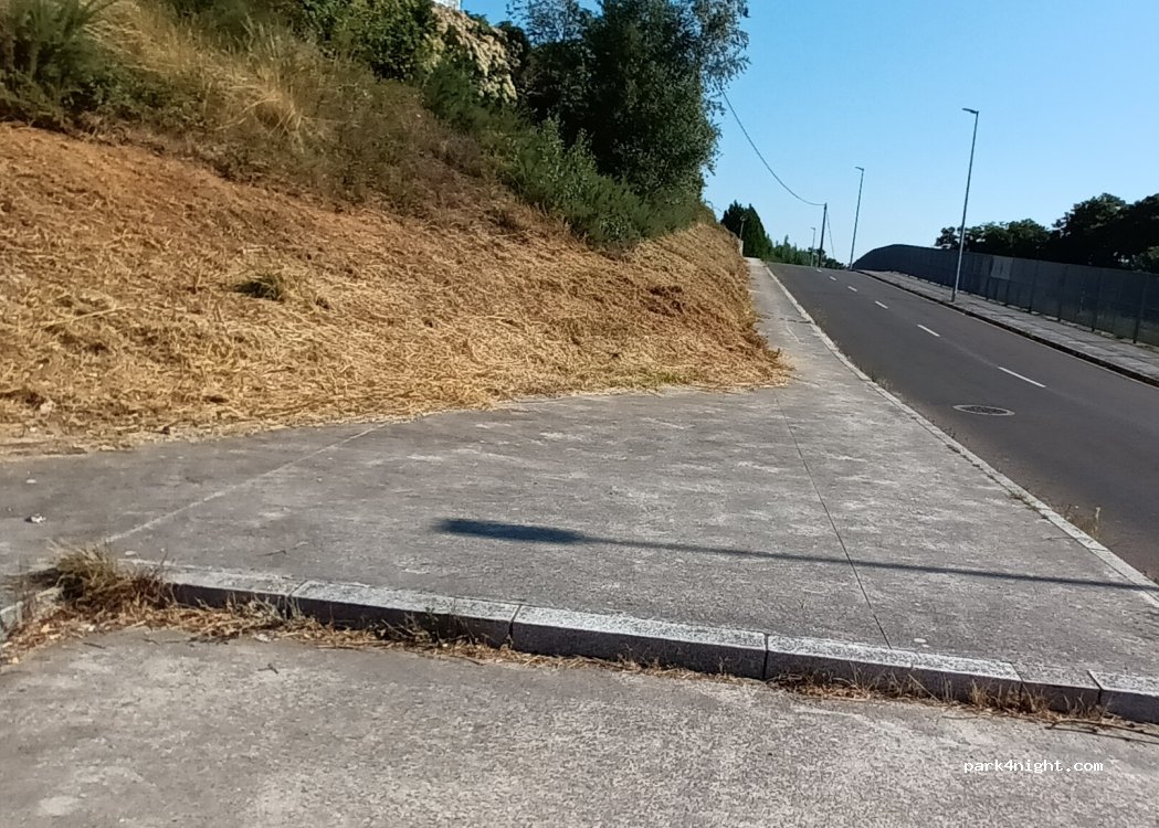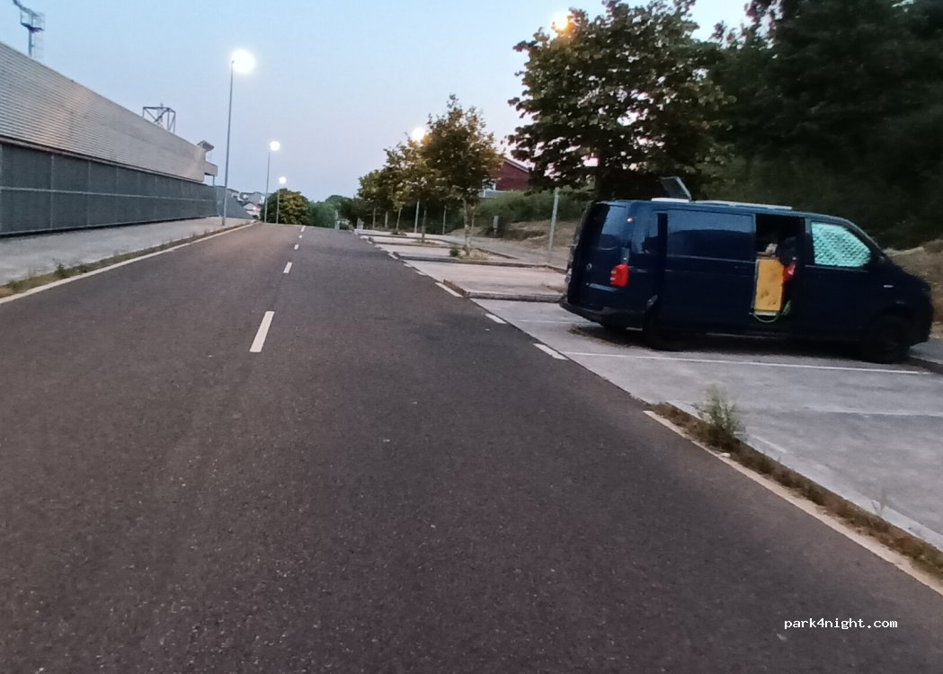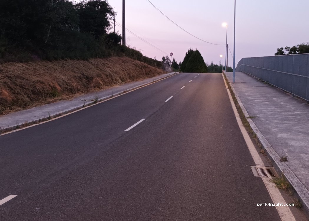 It's a 12-space parking lot, located at the entrance to the Sergas municipal soccer field. There are two large houses across the street. It's paved and doesn't look dirty. Perfect for spending the night. Since it's August, there's no traffic in the area. It's an upper part of the city.