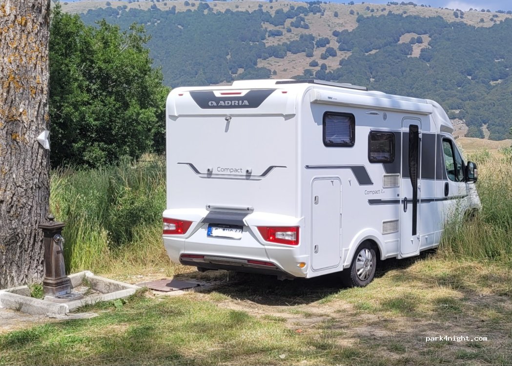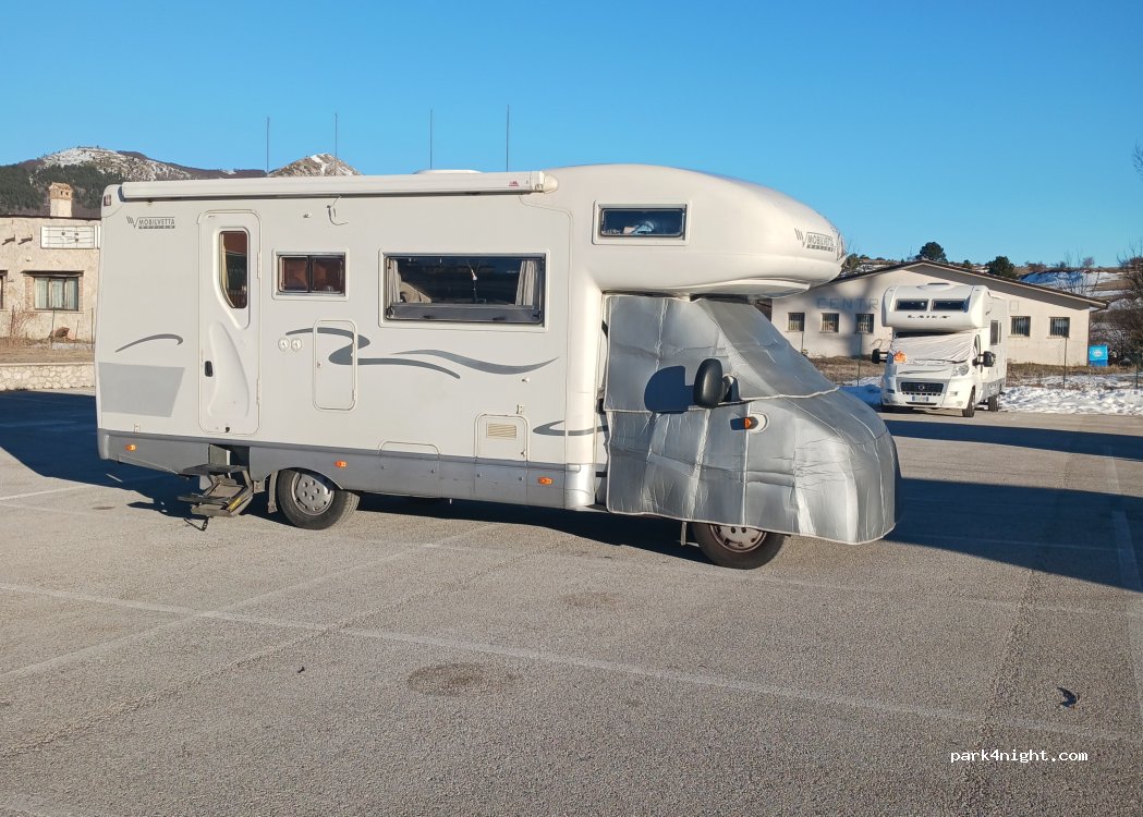 Parcheggio gratuito, con posizione strategica per Ovindoli o per escursioni partendo da rovere bellissimo borgno. Una griglia scarico acque grige/nere ma è una deduzione perche non è segnalato. Servito da un bar della stazione di servizio appena accanto ottimo panorama Periodo della mia permanenza 1 notte dicembre
