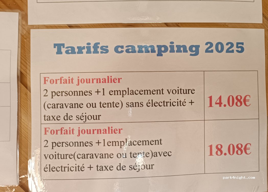 Effectivement. petit camping très sympa. Toilettes et douches très propres. Bel accueil. Très calme. Très chouette arrêt. Le boulanger passe tous les matins et c’est très bon. Je reviendrai. 14,08€ sans électricité 18,08€ avec électricité. Mais vous avez l’ombre les douches les toilettes. Je préfère donner mon argent à ce genre d’installation qu’à d’autre sans âme.