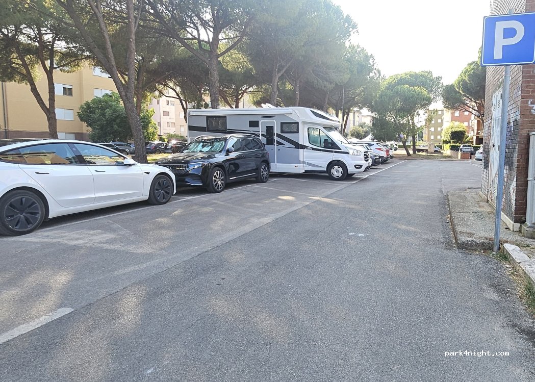 Parcheggio pubblico gratuito per auto, utilizzabile solo un lato posizionandosi a marcia indietro. Piazzole abbastanza larghe, solo 4 utilizzabili con mezzi lunghi. Ombra per gran parte del giorno. Potrebbe essere difficile trovare posto in alta stagione e nei fine settimana.