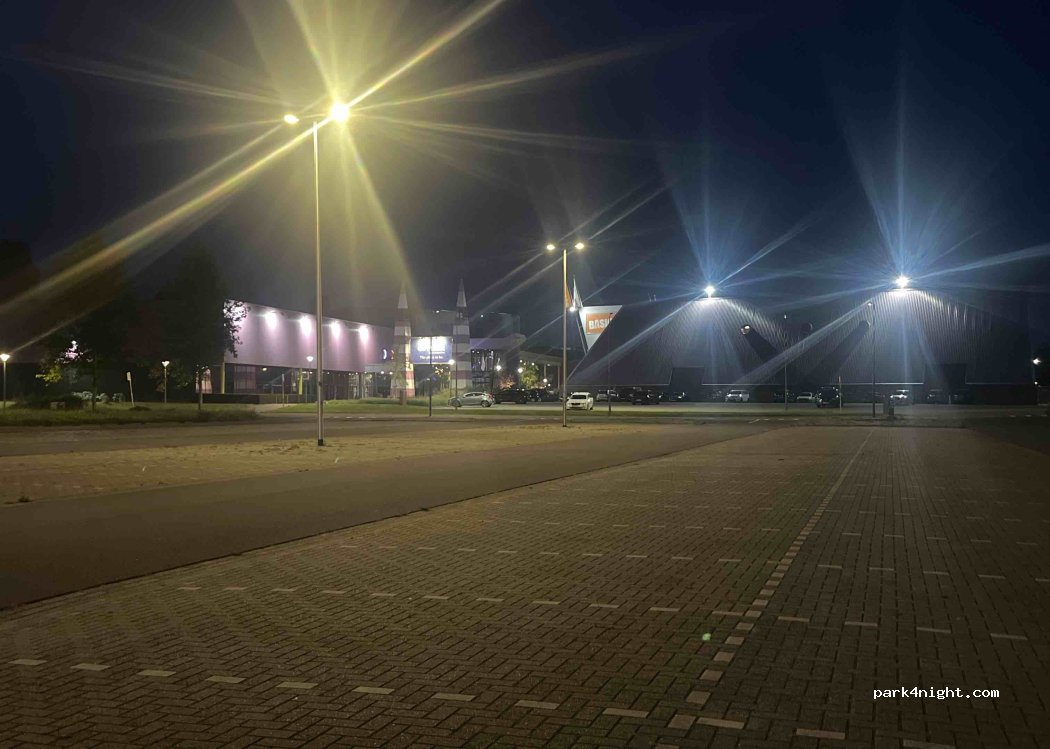 Grote parkeerplaats zonder beperkingen. Het is er wat donker door de straatverlichting, maar verder was het een rustige avond.