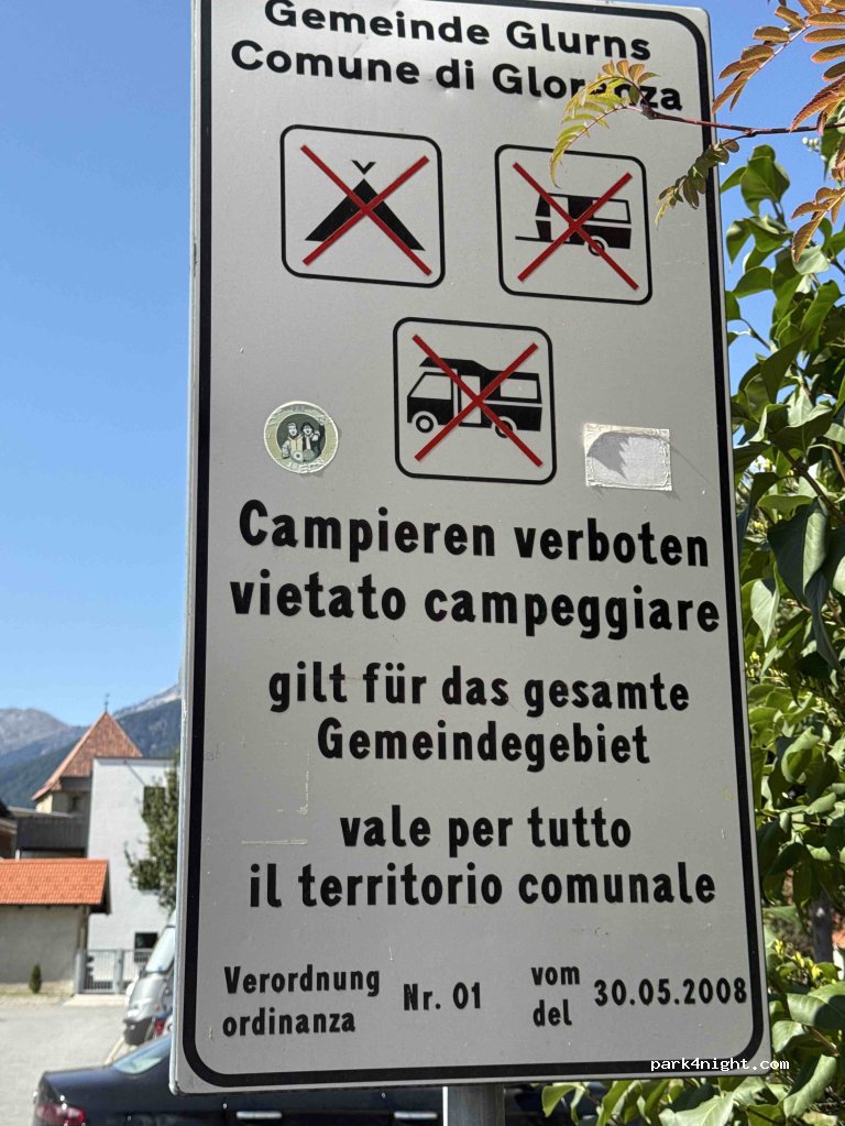 Parking à l'entrée du village, éclairé et équipé. Grand parking aux portes de la cité médiévale de Glurns avec toilettes publiques (modernes, propres et gratuites). Le parking du « Kasernenareal » (en venant de Sluderns) est idéal pour visiter la petite ville de Glurns. Il est également possible d'y stationner des bus. Cependant, ce parking n'est pas un lieu de séjour. Le camping nocturne sur le territoire communal et sur les places de parking de Glurns non réservées au stationnement est formellement interdit en vertu d'un arrêté municipal. Deux emplacements de camping sont disponibles à l'extérieur des remparts de la ville.