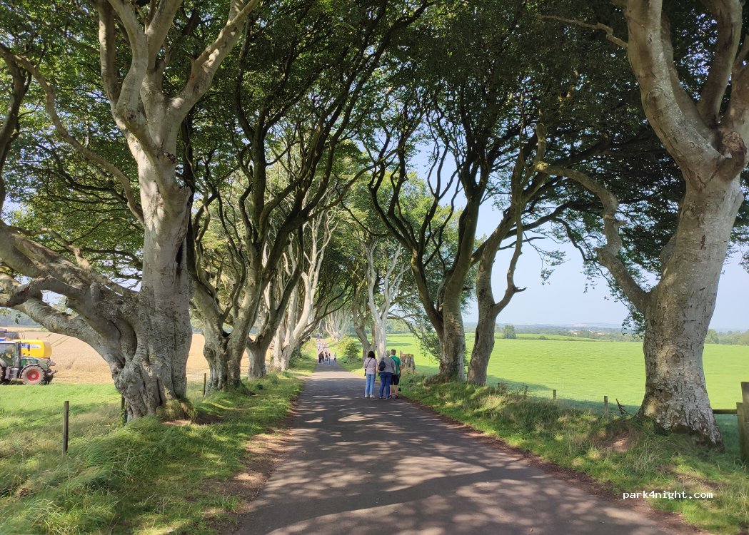 Hay un pequeño aparcamiento al final del camino de Dark Hedges. Una solución para evitar pagar 5 libras por aparcar en el aparcamiento del hotel. Hoy hay aparcamiento descubierto; no sé si se puede dormir allí.