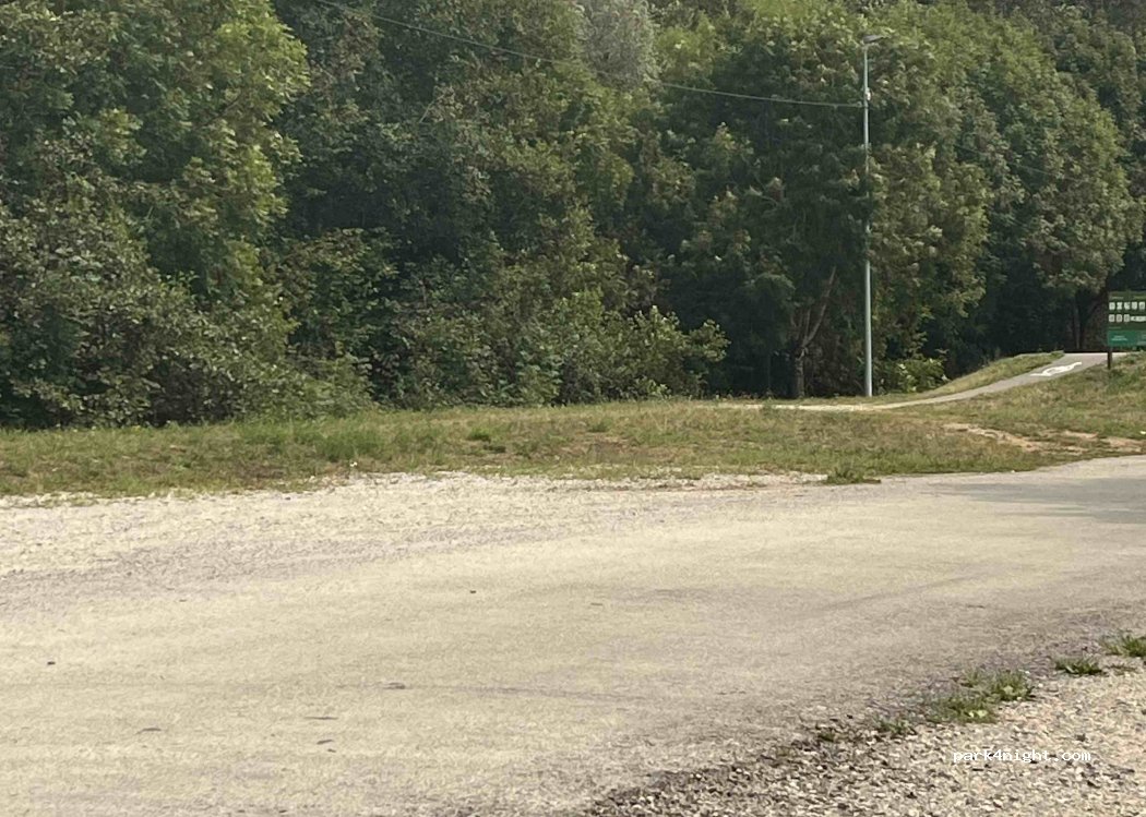 Parking calme, entouré d'arbres et de nature, avec vue sur les montagnes. Chaussée large et plate en gravier et asphalte. Un peu d'ombre est disponible près des poubelles. Idéal pour une pause détente en pleine nature.