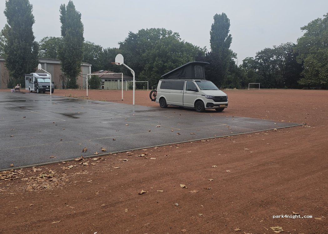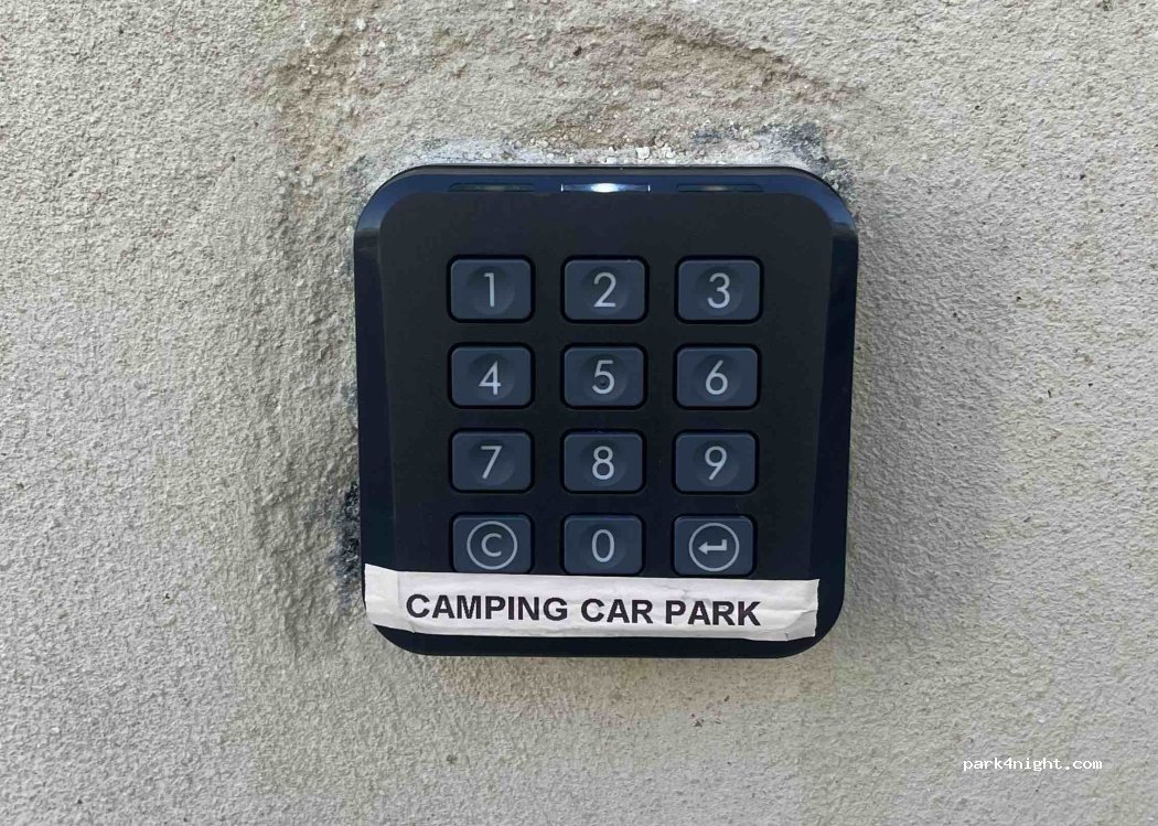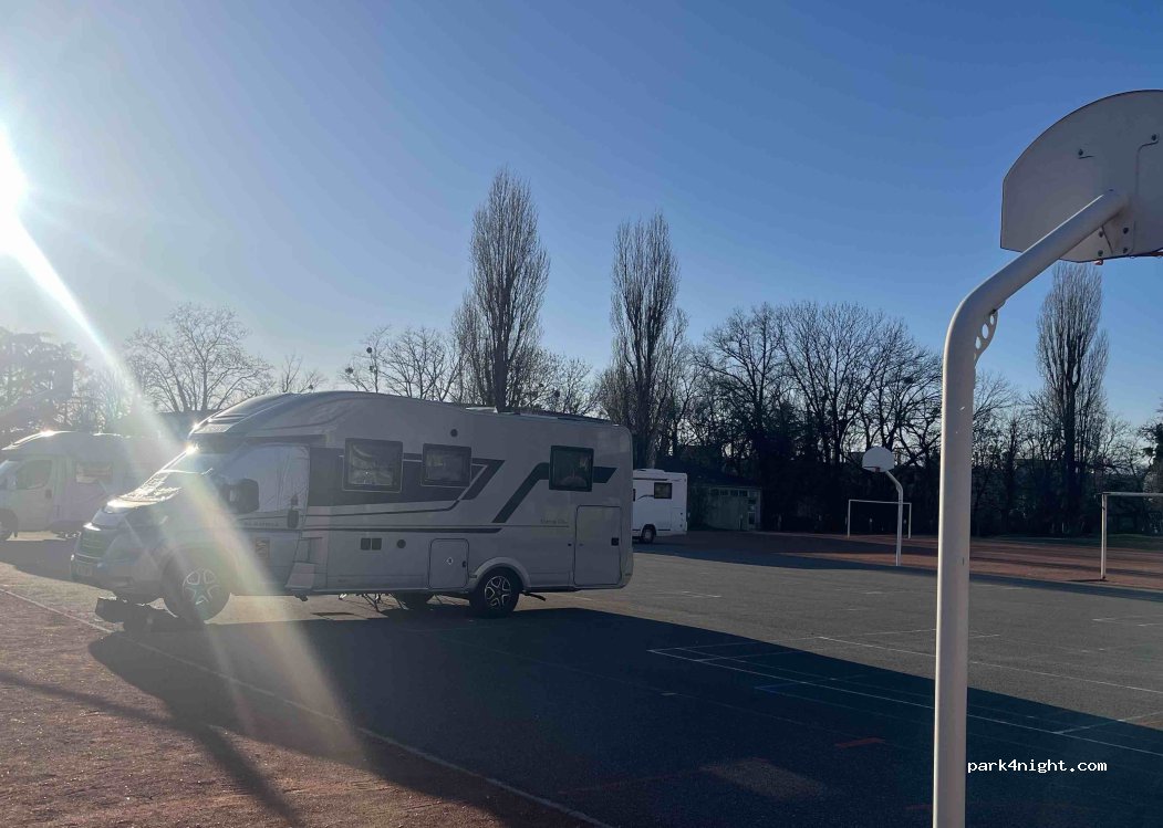 This park up is run by Camping car and is only open during the school holidays, you need to book through CC and get a code on your Ap, there is no CC sign on the front, the entrance is through the school gates No 63, there is a key pad on the wall with Camping car on it for the code issued by CC, We stayed 31/12/25, 3 other MH parked up.We paid €12 no facilities.