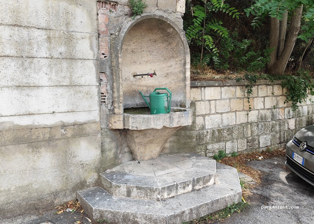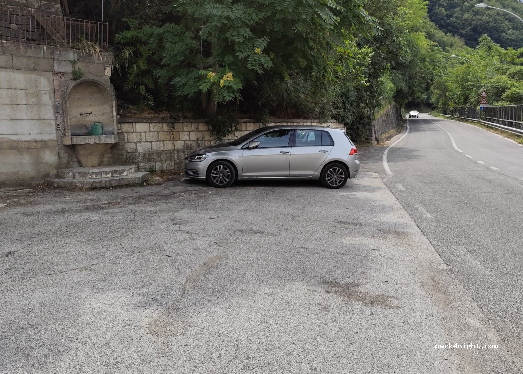 Fuente de agua con pequeño aparcamiento, al lado y enfrente, una pequeña tienda de comestibles y bar un poco más adelante.