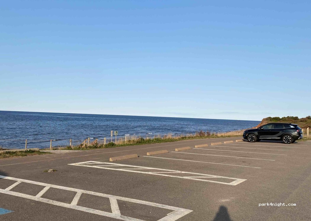 Parking avec superbe vue, table de pic-nic à disposition, poubelles, accès à la plage