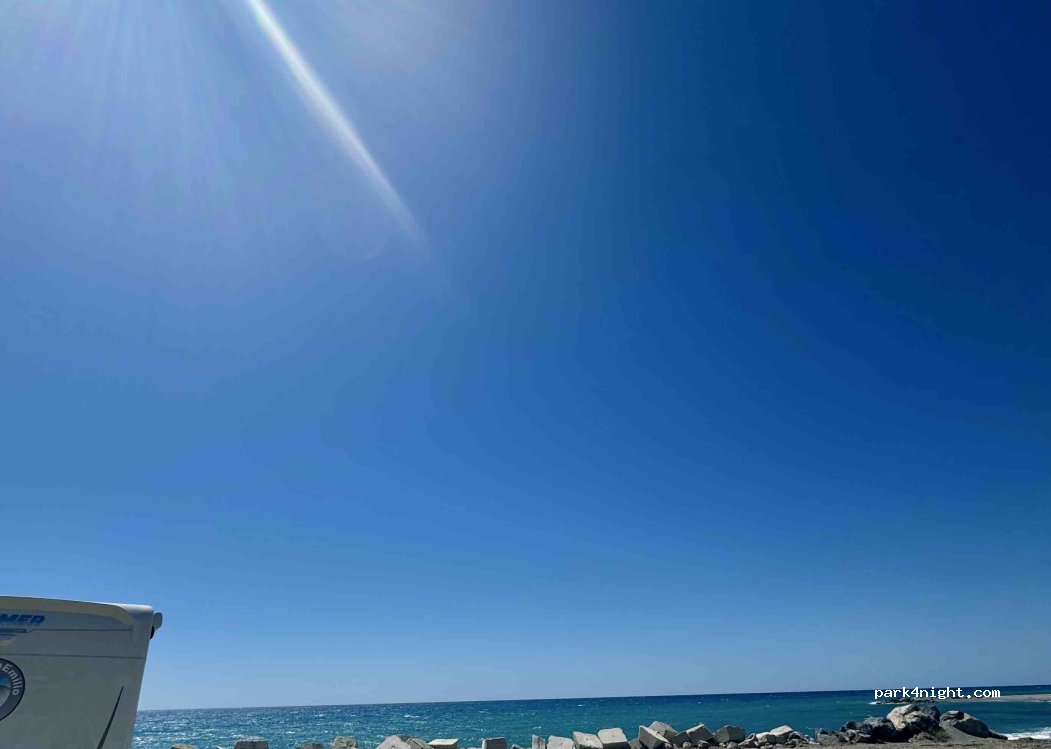 Kleiner Womo Stellplatz direkt am Meer. 18 € inklusive 3 A Strom. Fūr 6 A Strom 5 € Aufpreis. Warme Duschen 1 €. Stranddusche und Entsorgung vorhanden.