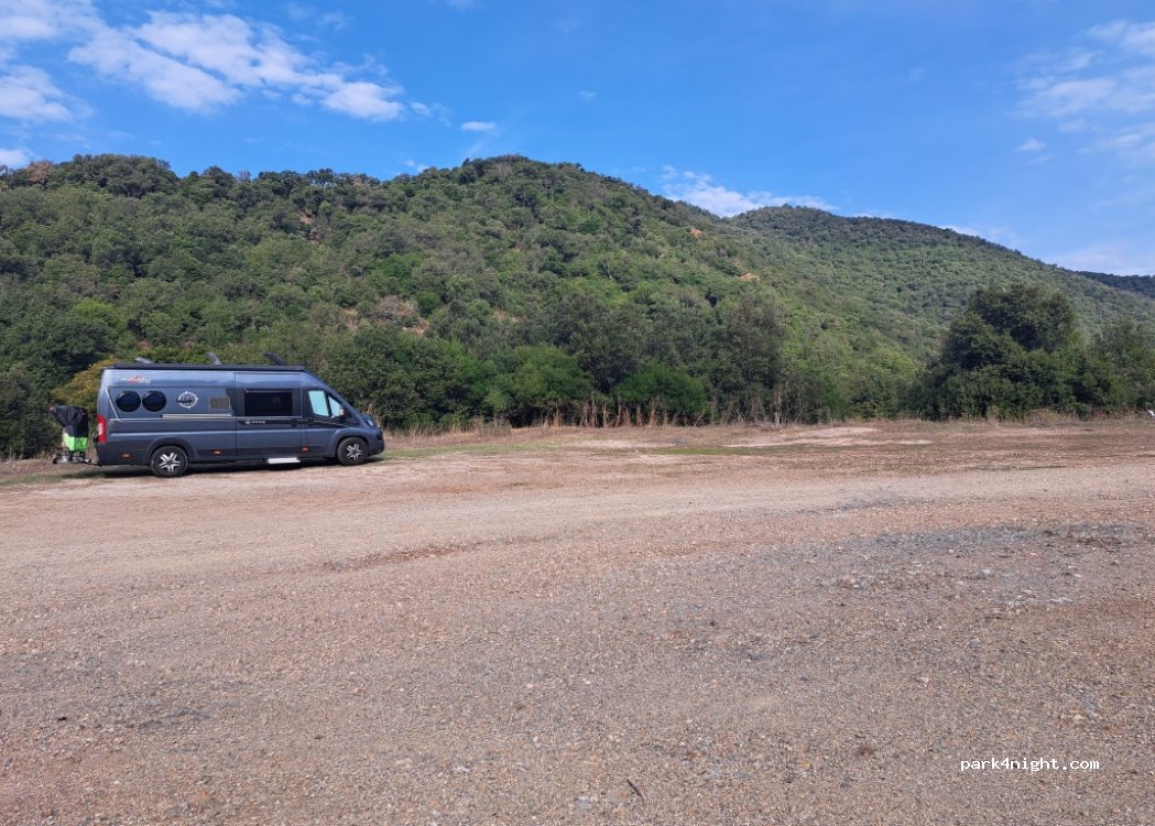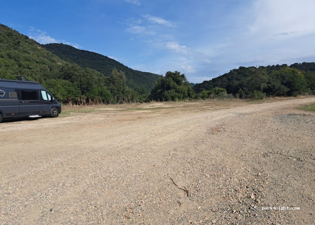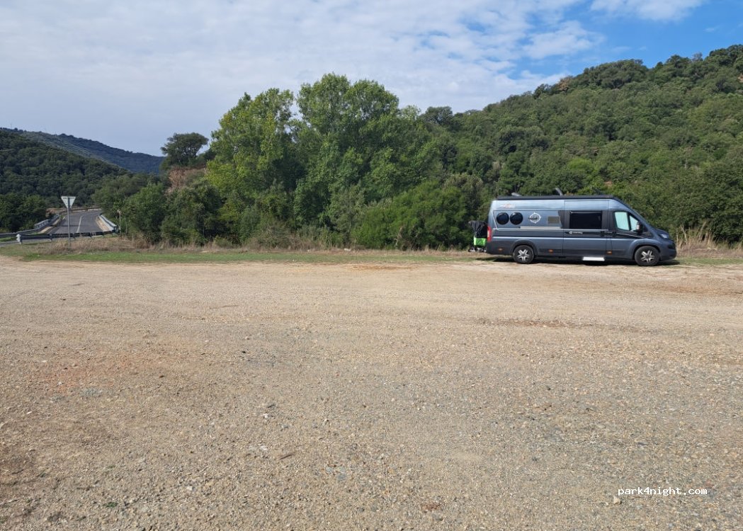 Un parking presque plat au bord de la route de campagne. Peu fréquenté la nuit, il offre un calme agréable pour dormir. Aucun panneau d'interdiction et de la place pour environ 4 à 5 camping-cars. On pourrait le décrire comme un parking pour randonneurs, avec un chemin de gravier qui bifurque à côté, menant peut-être à une ferme. Aucun service disponible.