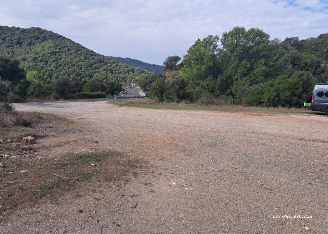 A nearly level parking lot next to the country road. There's little traffic at night, making it pleasantly quiet for sleeping. No prohibition signs and space for about 4-5 RVs. It could be described as a hiker's parking lot, with a gravel road branching off next to it, possibly leading to a farmstead. No services available.