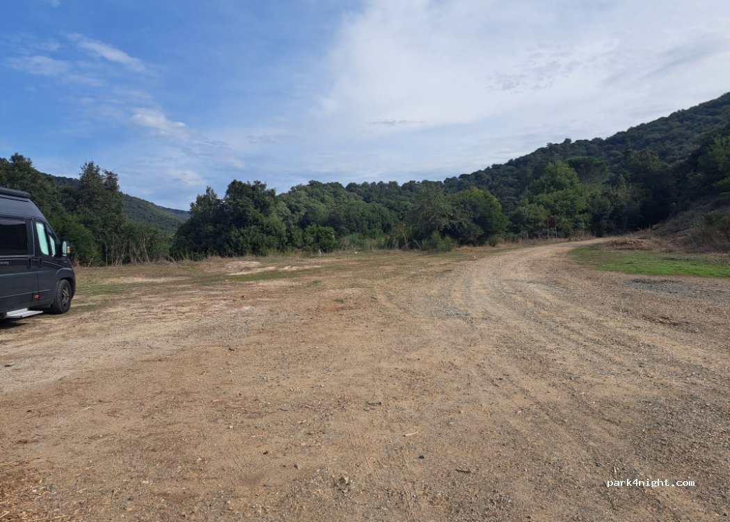 Un parcheggio quasi pianeggiante accanto alla strada di campagna. Di notte c'è poco traffico, il che lo rende piacevolmente tranquillo per dormire. Nessun cartello di divieto e spazio per circa 4-5 camper. Potrebbe essere descritto come un parcheggio per escursionisti, con una strada sterrata che si dirama accanto, probabilmente portando a una fattoria. Nessun servizio disponibile.