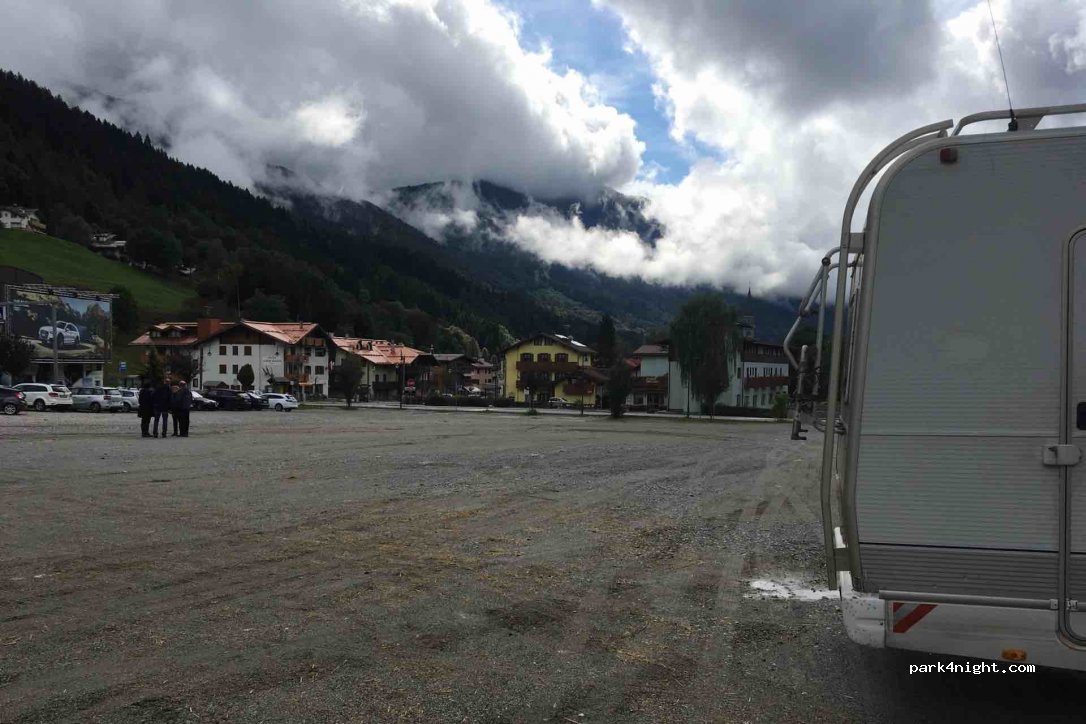 Grand parking en bord de route situé au pied du téléphérique et à la sortie de la jolie ville de Pinzolo. Très beau cadre, entouré de montagne, le parking est à proximité des toilettes (situés sous la rampe du téléphérique).