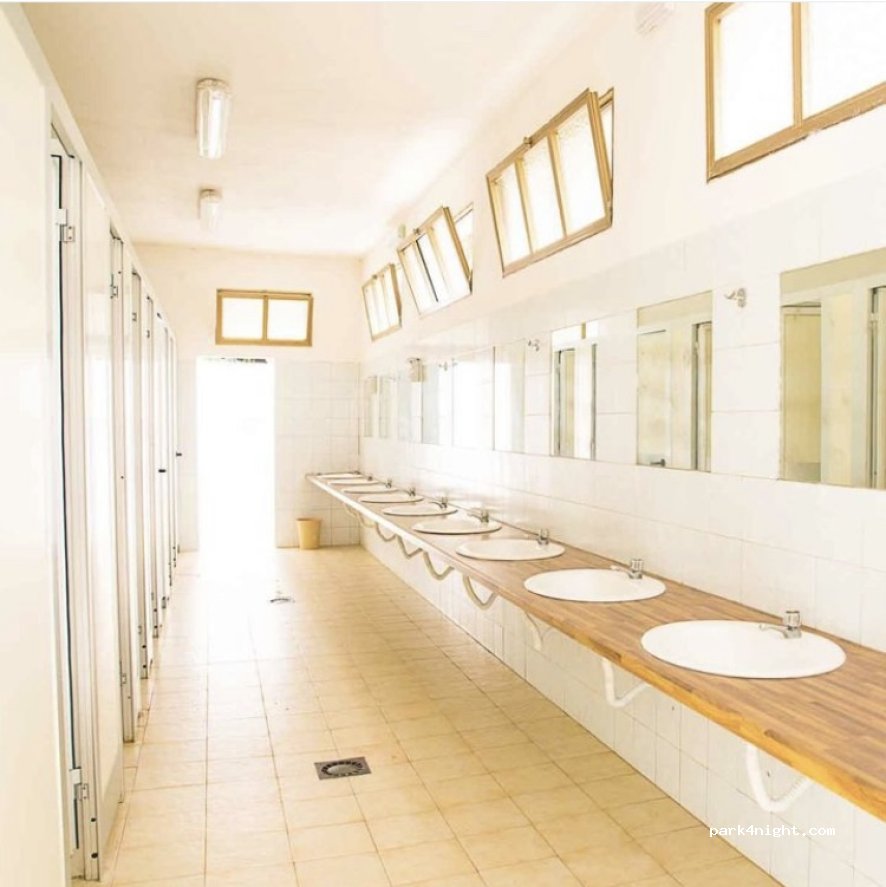 Very large camping on beautiful spot. Sanitary facilities are clean but old. Toilets without seats and toilet paper. Cold showers for free, hot showers needs token (0,70€ / 3 min). Shower heads are fixed high in the walls so it is not easy to wash small kids or babies and also to keep the towel/clothes dry. Sinks (also for dishes) only with cold water.