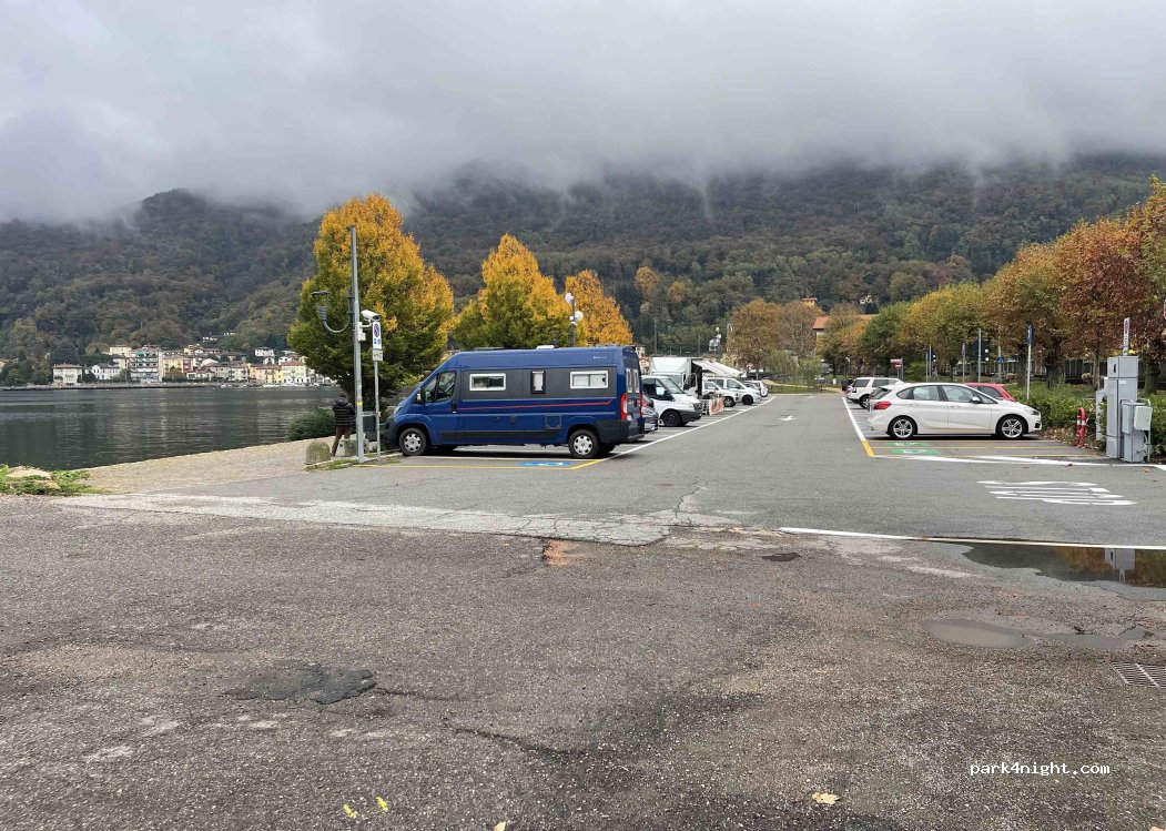 Great car park. Free with no restrictions when we stayed. beautiful views of the lake with lots of bars and restaurants nearby. A fruit and veg stall in the car park every day and toilets in the station open from 07:00 to 19:00. Locals seemed very friendly. We walked in to Switzerland (but you could take the boat). Train to Milan from station. Didn't see the water tap previously mentioned.