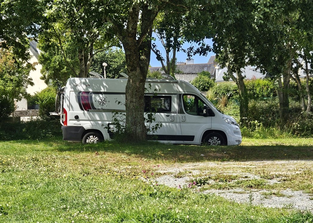 Aire très au calme… proche des commerces du bourg.passé une très bonne nuit dans la verdure .le service camping car est en panne sauf eau grise. Prévoyez l’autonomie pour vous poser là.merci à la commune de locmaria.