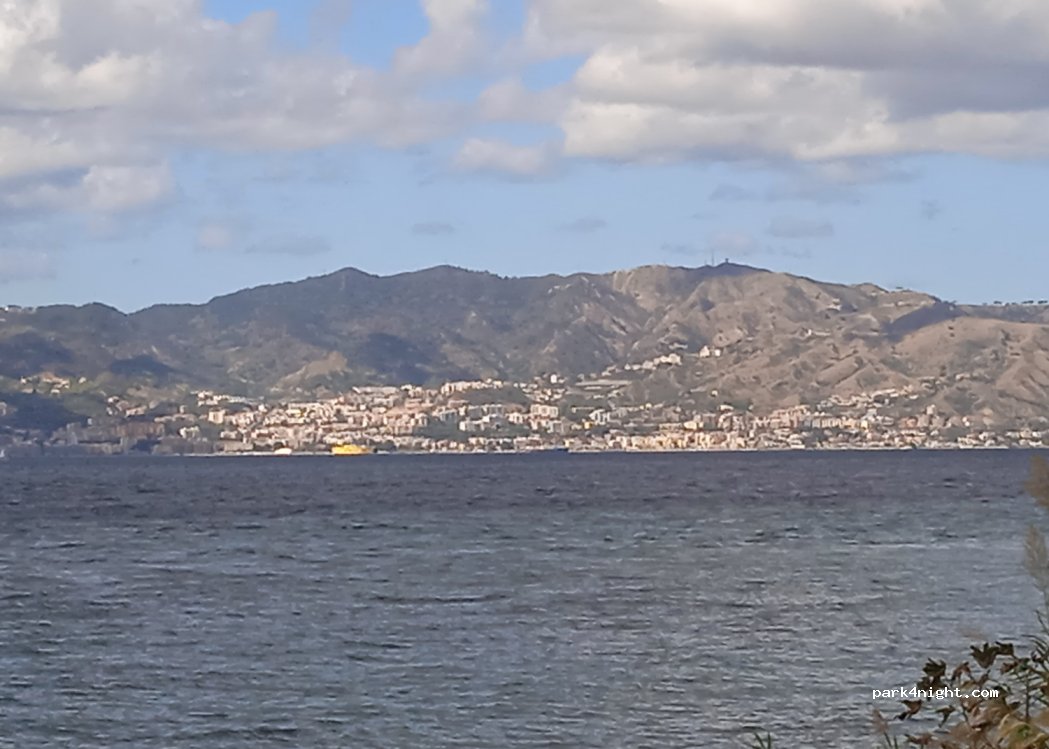 Belle vue sur la Sicile malgré les nuages !Parking tranquille, avec des pêcheurs, bien pour attendre la traversée vers la Sicile! En cours de nettoyage avec une grande benne, j'ai vue pire ailleurs !
