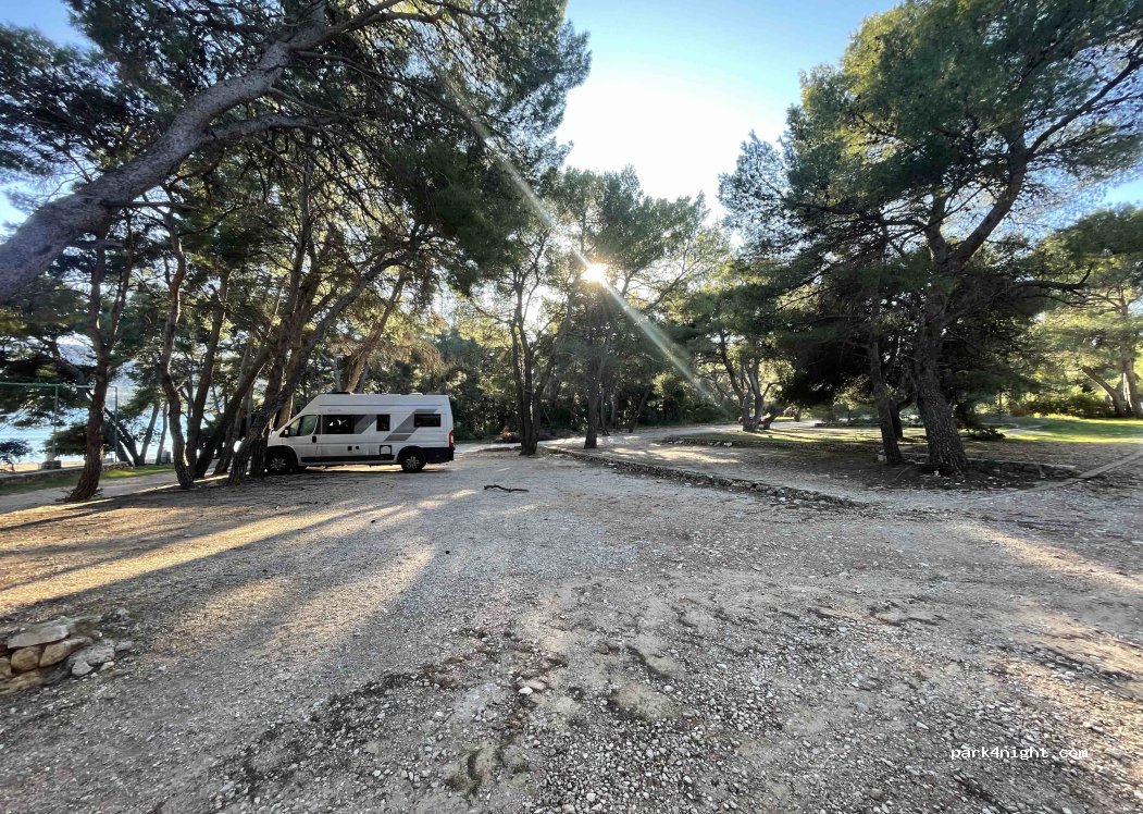 Nous sommes restés là 3 nuits. Gratuit hors saison et avec les toilettes très clean de l’hôtel en accès libre. Endroit propre comparé à beaucoup de lieux découverts en Croatie. Pensez à emmener vos déchets (où les mettre dans les poubelles proches). Wifi de l’hôtel disponible et douches extérieures tièdes. Superbe endroit sous les pins. NB: nous vous conseillons de faire 1 plongée au blackpearl.