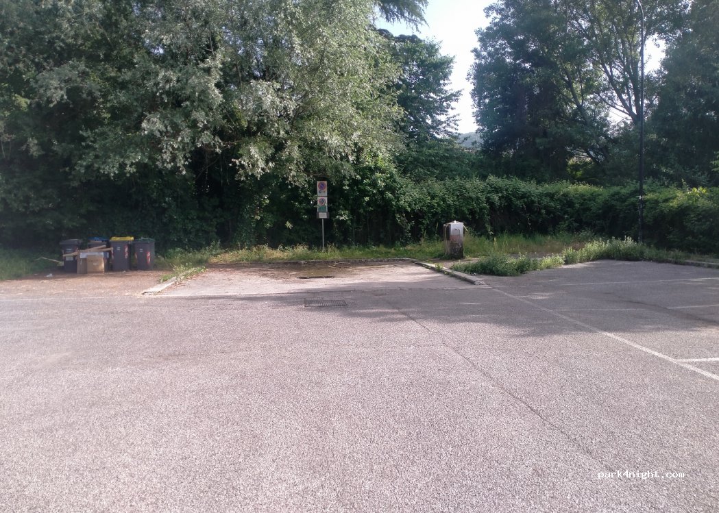 Qui la gente campeggia e mette tavoli e sedie fuori dai camper, in permanenza. Questo non dovrebbe essere permesso. Impedendo il libero uso dello spazio per passare un paio di notti e usufruire dei servizi. Di notte é silenziosa. Di giorno stare direttamente sotto un ponte transitato, lo rende rumoroso.