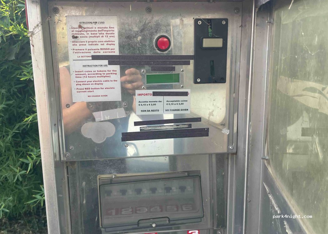 Confermo, la colonnina che eroga corrente è spenta, lo scarico acque nere non funziona. c'è acqua potabile e un erogatore gratuito di acqua frizzante e fresca. Ci sono tre parcheggi grandi riservati ai camper. Sosta in zona frequentata e trafficata.