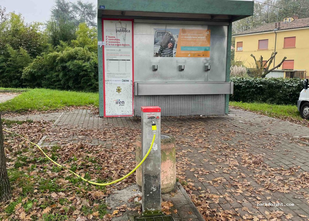 A quiet parking on the edge of Guastalla. there are 3 signalled and marked motorhome places and 2-3 signed but not marked places, wide and very long. The drinking water works from the public fountain. Water and toilet disposal next to the non-potable water tap, or at the far end of the parking - somebody was washing their car here. Water free. Close to center on foot. Quiet at night.
