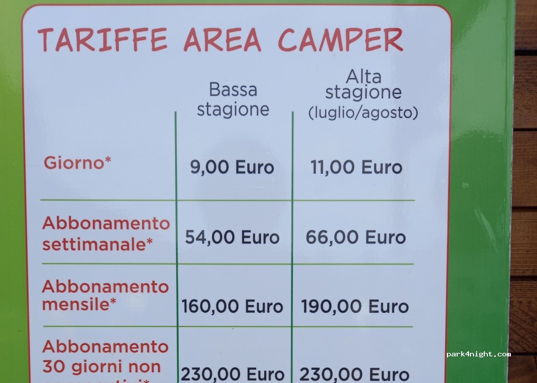 ottimo , prezzi onesti, se hai bisogno corrente ci sono colonnine a pagamento, altrimenti paghi dalle 8€ alle 10€ per il pernottamento. c'è carico e scarico e molto tranquillo la notte. bello e spazioso...