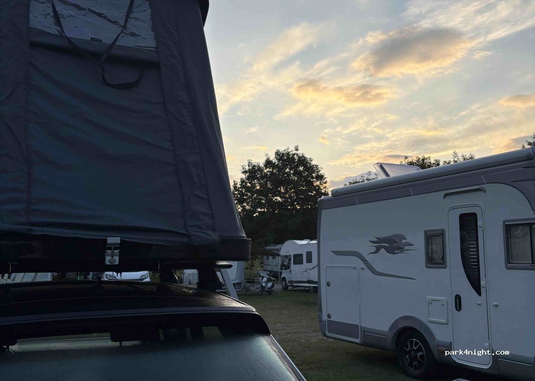 Ampia area sosta su prato. Non tutti gli stalli (liberi) hanno l'allaccio elettrico (pagabile separatamente se necessaria). Completo di CS. Necessario fare attenzione agli orari e alle tariffe posti all'ingresso per usufruire della tariffa intera o mezza giornata.