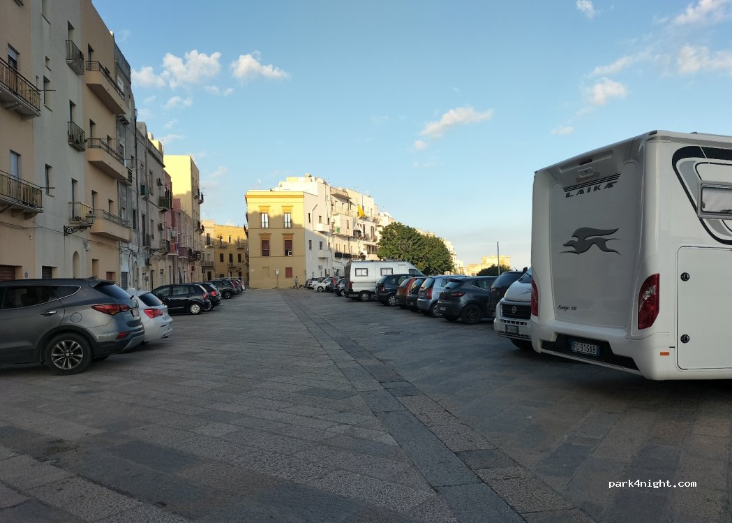 Parking public directement sur le front de mer. Attention: En fait une "Zona Traffico Limitato", mais maintenant (au tournant de l'année, 31.12-1.1.) Nous avons encore osé le faire. Après 24 heures, pas de problême. En attendant, 5 campeurs italiens ont été ajoutés, beaucoup d'Italiens avec leurs voitures viennent ici pour une photo. Nous avons eu la vue magnifique et la paix, le risque vaut la peine. Contrairement au parking du port (à seulement 100m d'ici), il est merveilleusement calme, même le jour de l'an ...