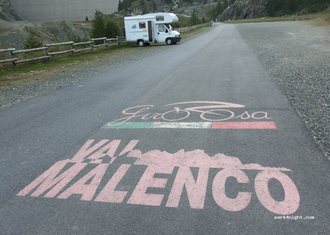 Gravel parking at the height of the second artificial lake (Lago di Alpe Gera). Quiet but cold night.
