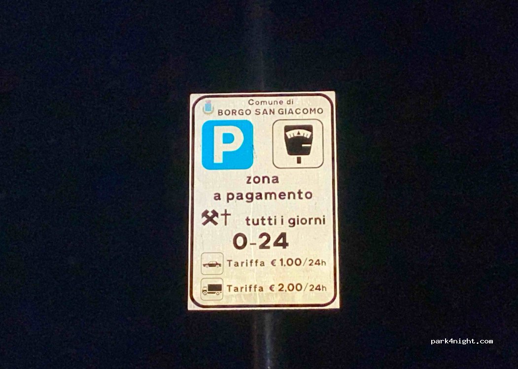 Je viens tout juste d'arriver, je vois le panneau indiquant les tarifs de stationnement (photo ajoutée) pour le paiement il y a un horodateur face à l'entrée de LA DISPENSA. Tout est parfaitement calme, il a beaucoup plu mais c'est stable sur le gravier. L'ensemble du village a du caractère avec ses bâtiments en briques