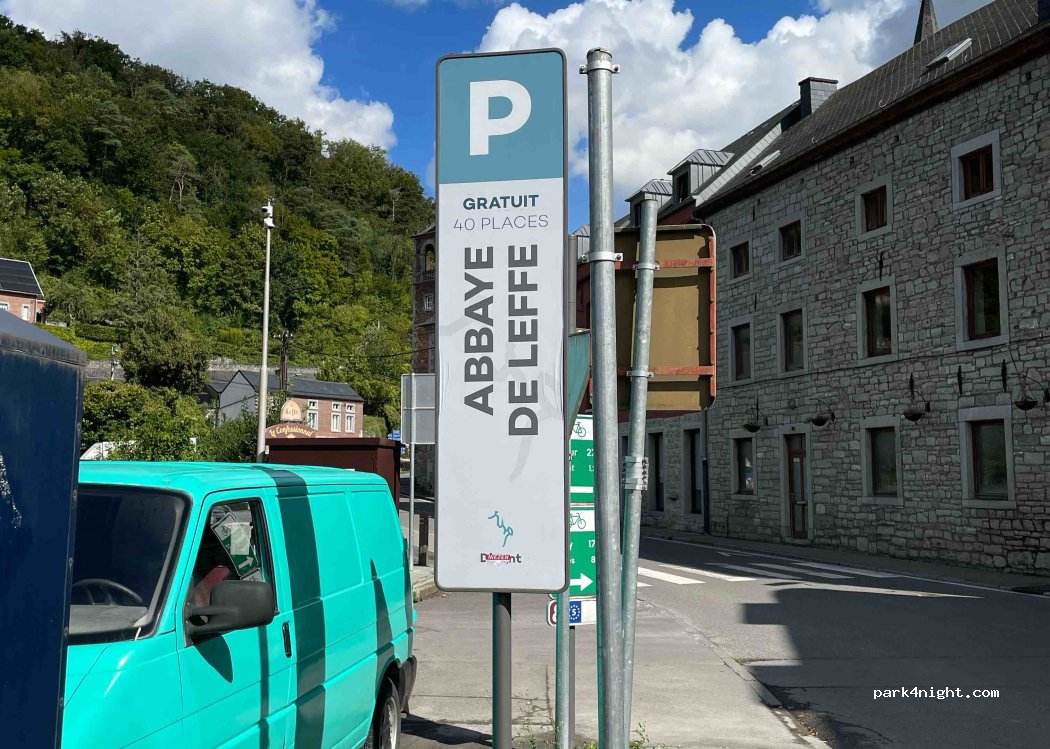 Parcheggio gratuito condiviso con auto.A 20minuti dal centro di fronte alla Leffe(non visitabile; brasserie con orario molto particolare!)Abbiamo passato una notte dopo aver passato la serata in centro,ma a saperlo saremmo andati nell'area Aire du Quesval a Yvoir dove abbiamo fatto scarico e carico il giorno dopo.Sconsigliato per la notte,ok per visita alla città bellissima in periodo natalizio.